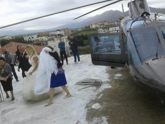 Dasmat shqiptare jan ë kthyer n ë evente ku nuk mungon aspak luski dhe shpenzimet e çmendura. Nj ë sken ë prej nj ë dasme marramend ëse ësht ë ajo q ë duket n ë pamjet q ë vijn ë nga zona e Saukut, ku dit ën e djeshme, dh ëndri, nj ë emigrant nga Italia ia ka dalë që t’i habis ë të gjithë duke e marë nusen me helikopter. Ndryshe nga shumë të tjerë që krijojnë karvane me makina e bori, ai ka zgjedhur nusen ta marri me helikopter nga fshati Koçaj në Baldushk dhe ta sjelli në Sauk. Megjithëse distanca ështe fare e shkurtër, kjo nuk ka patur rëndësi në përzgjedhjen e dhëndrrit emigrant, por zhurma në këtë rast vlen më shumë se qëllimi.Në këtë rast, ndryshe nga zakonet tona, nusja nuk hyn nga “dera” po nga “çatia”. I pranishëm mes dasmorëve është dhe helikopteri që është ulur në taracën e vilës. /Alpene ës.al/
