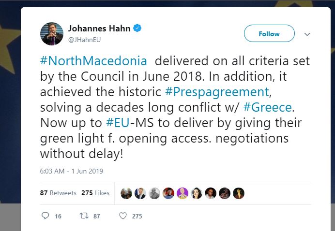 Një postim i fundit në Twitter nga Johannes Hahn, Komisionerit Evropian për Politikën e Fqinjësisë Evropiane dhe Negociatat e Zgjerimit, mesa duket ka treguar më shumë sesa deklaratat në komisione apo në intervista.