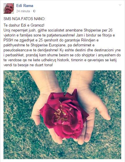 Kryeministri dhe kryetari i PS, Edi Rama ka publikuar sot mesazhin e Fatos Nanos që u ka dërguar Ramës dhe Rucit me rastin e festës së PS.