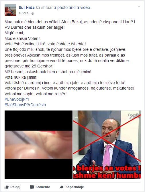 Me këto fjalë, vëllai i Afrim Bakut, ish-drejtori i emëruar nga PS-ja në AKU-në e Durrësit, i ka telefonuar një mbështetësi të LSI-së duke i bërë ofertë që vetëm e vetëm të mos votojë për LSI-në. Ai e fton edhe për kafe, teksa Sul Hida, mbështetësi i LSI, e ka publikuar bisedën në profilin e tij në FB, me një reagim ku bën thirrje të mos shitet vota.
