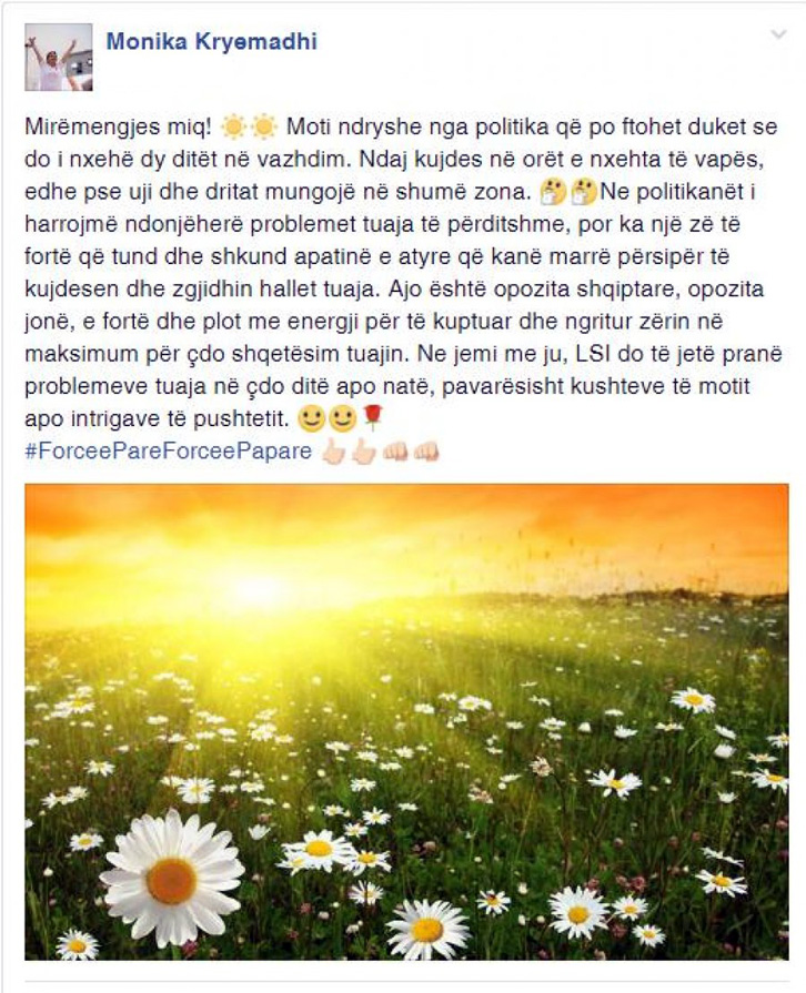 Kandidatja e vetme deri tani për kreun LSI-së, Monika Kryemadhi përcjell një mesazh.