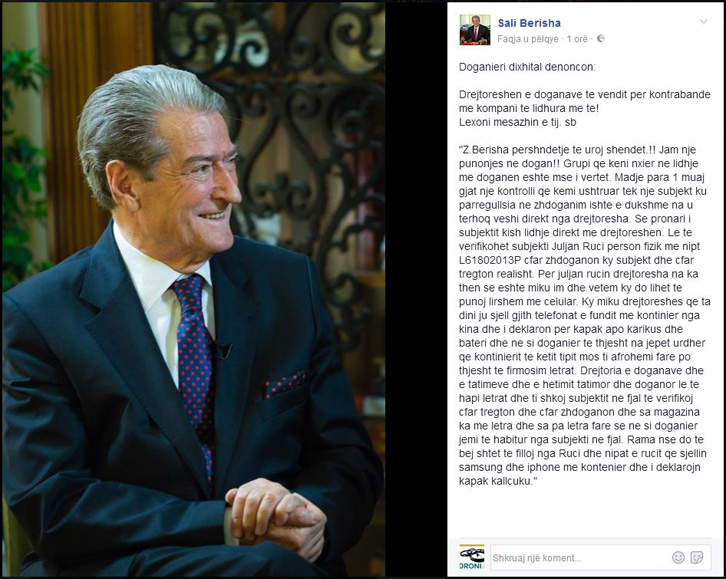 Vijon denoncimi i kontrabandës me ndihmën dhe “bekimin” e drejtuesve të këtij institucioni. Sërish, ish-kryeministri Sali Berisha, duke përcjellë një mesazh të “doganierit dixhital”, denoncon skemën e kontrabandës me telefona celularë, të nipërve të Gramoz Ruçit, me ndihmën dhe bekimin e kryedoganieres shqiptare.
