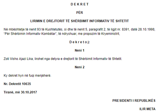 Presidenca publikon shkresën zyrtare ku dekreton lirimin nga detyra të drejtorit të Shërbimit Infomativ të Shtetit, Visho Ajazi Likës.