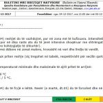 Sot pasdite (e hënë, dt. 04) reshjet do të vazhdojnë, por në zona më të kufizuara. Intensiteti i tyre do të jetë i dobët në shumicën e rasteve, por në disa raste ato do të jenë intensive shoqëruar me shtrëngata, kryesisht në qarqet e Veriut dhe të Qendrës (me kohëzgjatje të shkurtër). Reshjet do të jenë në formë dëbore në zonat malore, kryesisht në veri dhe lindje të vendit. Nesër (e martë, dt.05) nuk priten reshje (siç tregohet në tabelë, respektivisht për secilin qark).