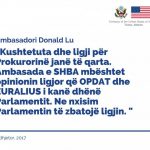 Lidhur me procesin e zgjedhjes së Prokurorit të Përgjithshëm, pas përfundimit të mandatit për Adriatik Llallën, ka reaguar edhe ambasadori i SHBA-së në Tiranë Donald Lu. Ambasada e SHBA-ve në Tiranë në një postim në Facebook, citon fjalët e ambasadorit Lu për këtë proces. “Kushtetuta dhe ligji për prokurorin janë të qarta. Ambasada e SHBA-së mbështet opinionin ligjor që OPDAT dhe Euralius i kanë dhënë parlamentit. Ne nxisim parlamentin që të zbatojë ligjin’, thuhet në tekst.