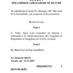 Ish-kreu i SHISH, Visho Ajazi sapo është dekretuar nga Presidenti Ilir Meta si ambasador i Shqipërisë në NATO. Emri i Ajazit është propozuar nga kryeministri Edi Rama, ndërsa bashkë me të Kreu i Shtetit ka dekretuar edhe Igli Hasanin si ambasador të Shqipërisë në OSBE. Meta ka dekretuar edhe ambasadorin e ri të Shqipërisë në Strasburg. Bëhet fjalë për Albana Dautllarin, e cila është dekretuar nga presidenti si ambasadore rezidente në Strasburg.