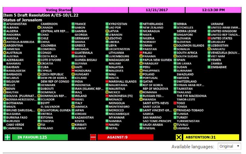 Organizata e Kombeve të Bashkuara, ka votuar sot me 128 vota pro dhe 9 kundër, 35 abstenime, për të rrëzuar vendimin e Presidentit amerikan Donald Trump, për të shpallur Jerusalemin kryeqytet të Izraelit. Në këtë samit mori pjesë dhe Shqipëria e cila ka të drejtën e votës, dhe e ka hedhur atë, kundër SHBA-së. Votimi është pritur më interes të madh, pasi ShBA si rrallë herë nuk gëzon mbështetjen e aleatëve tradicionalë në nismën më të fundit të Uashingtonit.
