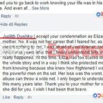 Përmes një komenti në statusin e Elizës, ka reaguar edhe nëna e saj Judith, e cila shkruan: “E pranoj ndëshkimin tuaj, si mamaja e Elizës. Jo, nuk kisha frikë se ai do t’i prishte punë me karrierën, sepse për mua s’ka asnjë vlerë. Edhe unë kisha frikë nga Joel Kramer. Vetëm vite më vonë e kuptova plotësisht se çfarë kishte ndodhur. Në atë kohë, Eliza ishte shumë e frikësuar dhe nuk e tregonte të gjithë historinë. Mendoj se në një mënyrë, po përpiqej të më mbronte duke mos e ditur sepse ajo e dinte sa frikë i kisha burrat e pushtetshëm në shesh-xhirim”. Judith i kthen përgjigje komentit të një vajze, e cila i shkruan se në një rast të ngjashëm, mamaja e saj nuk e kishte lejuar diçka të tillë të ndodhte: “Falënderoje mamanë tënde për atë çfarë ka bërë për ty. Do të doja të kisha qenë po aq e guximshme”.