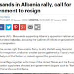 Agjencia ndërkombëtare e lajmeve Assosiated Press shkruan se opozita e Shqipërisë zhvilloi një protestë kundër qeverisë duke e akuzuar për lidhje me krimin e organizuar dhe bënë thirrje për dorëheqjen e saj. Më tej në shkrimin e AP-së thuhet se mijëra mbështetës të Partisë Demokratike dhe të aleatëve të saj si Lëvizja Socialiste për Integrim dhe partitë e tjera më të vogla u mblodhën të shtunën në kryeqytetin e Tiranës, për të protestuar kundër qeverisë.