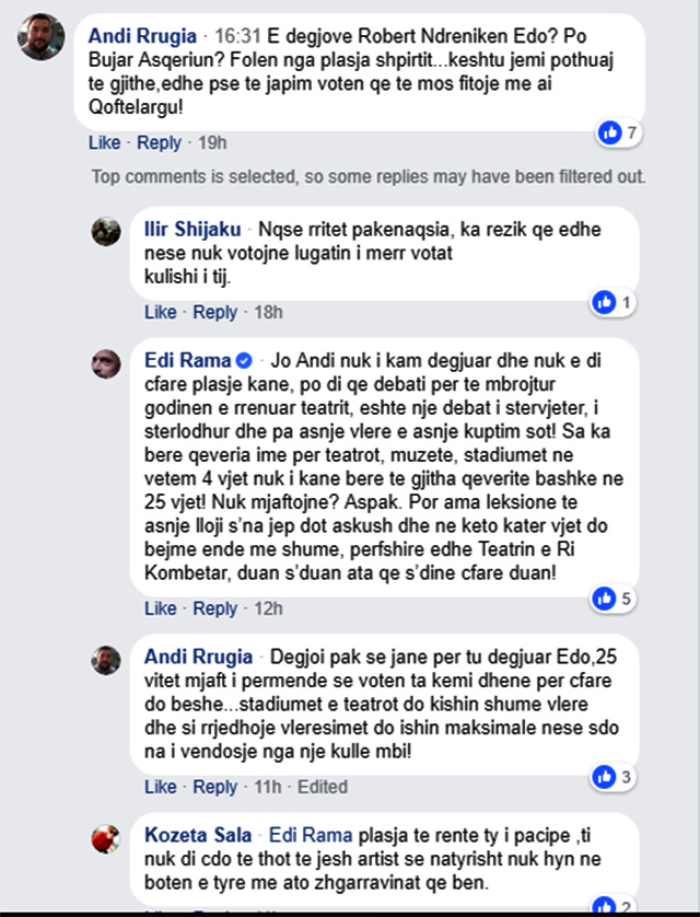 Rama: Jo Andi nuk i kam degjuar dhe nuk e di cfare plasje kane, po di qe debati per te mbrojtur godinen e rrenuar teatrit, eshte nje debat i stervjeter, i sterlodhur dhe pa asnje vlere e asnje kuptim sot! Sa ka bere qeveria ime per teatrot, muzetë, stadiumet ne vetem 4 vjet nuk i kane bere te gjitha qeverite bashke ne 25 vjet! Nuk mjaftojnë? Aspak. Por ama leksione te asnjë lloji s’na jep dot askush dhe ne keto kater vjet do bejme ende me shume, perfshire edhe Teatrin e Ri Kombetar, duan s’duan ata qe s’dine çfarë duan!