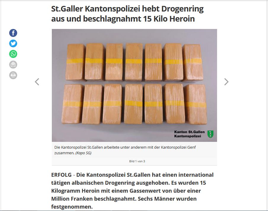 Policia e kantonit St. Gallen në Zvicër ka shkatërruar një grup të organizuar kriminal, që trafikonte drogë të fortë. Mediat zvicerane thonë se grupi kriminal shqiptar trafikonte heroinë.