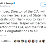“Jam krenar që emëroj drejtorin e CIA-s, Mike Pompeo si sekretar i ri i shtetit. Mike doli i pari i klasës në Akademinë Ushtarake West Point, është dekoruar për shërbimin ushtarak dhe ka mbaruar me nota të larta departamentin e juridikut në Harvard. Më pas ai ka qenë anëtar i Dhomës së Përfaqësuesve, ku ka dëshmuar aftësinë për të bashkëpunuar me ligjvënës të partisë opozitare”.