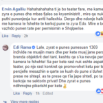 Ervin Agalliu – Hahahahahaha ti je bo teater fare, me kamera te zyra e punes dhe mbas fjales se kryeministrit , mire qe nuk e puthi punonjesja kur arriti hallexhiu. Dergo dhe ndonje hallexhi me kamera te fshehte te kerkoj pune te zyra Edo. Mire e bo lale vazhdo punen tate per permisimin e Shqiperise.