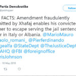 Partia Demokratike ka informuar kryeministrat e huaj, zyrtarë të lartë, Departamentin Amerikan të Shtetit, FBI, ministrinë e Jashtme të Britanisë dhe gjithë institucionet e rëndësishme për dosjen e vëllait të ministrit të Brendshëm, Fatmir Xhafaj, dënuar nga gjykata e kasacionit në Itali, si pjesë e një bande ndërkombëtare të drogës, si dhe për falsifikimin që sipas PD, Xhafaj i ka bërë ligjit të ekstradimit për të mbrojtur të vëllanë.