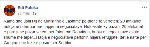 Nënkryetari i Partisë Demokratike, Edi Paloka, ka reaguar lidhur me ardhjen e 20 emigrantëve nga Afrika në Shqipëri.