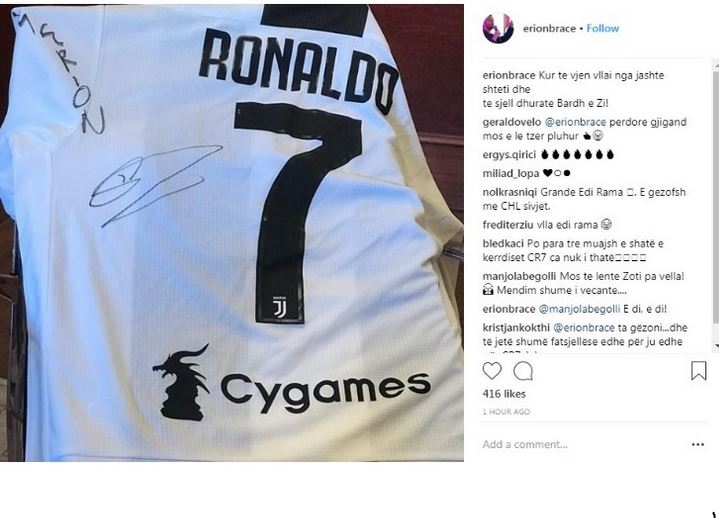 Të njëjtën bluzë të nënshkruar me autografin e Ronaldos ia bën dhuratë deputetit Erion Braçe, i njohur si një tifoz i flaktë i Juventusit, Italisë dhe Partizanit. Me anë të një fotoje në rrjetet sociale, Braçe ka treguar autografin duke shkruar batutën e shumë përdorur të shqiptarëve.