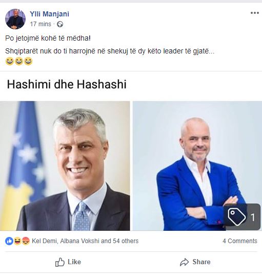 Ish-ministri Ylli Manjani ka ironizuar sërish në facebook udhëheqjen e dy liderëve të shqiptarëve, Thaçin për Kosovën dhe Ramën për Shipërinë.