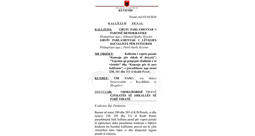 Sipas dokumentit, kallëzimi mban datën 3 tetor 2018 dhe grupet parlamentare të PD dhe LSI përfaqësohen nga kryetarët respektivë Edmond Spaho dhe Petrit Vasili.