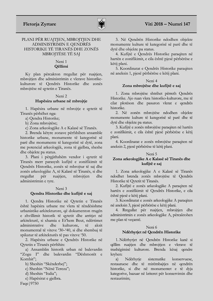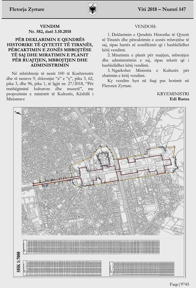 Me vendimin nr.582 , date 3.10.2018 Keshilli i Ministrave ka miratuar “Deklarimin e Qendrës Historike të Qytetit të Tiranës dhe percaktimin e zonës mbrojtëse të saj dhe miratimin e planit të ruajtjes ” .