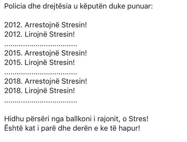 Duke kujtuar faktin se Stresi njëherë u është larguar duke u hedhur nga dritarja e rajonit nr.3 në Tiranë, moderatori thotë se duhet të bëjë të njëjtën gjë sërish.
