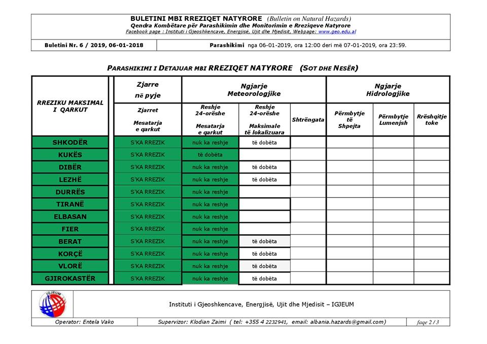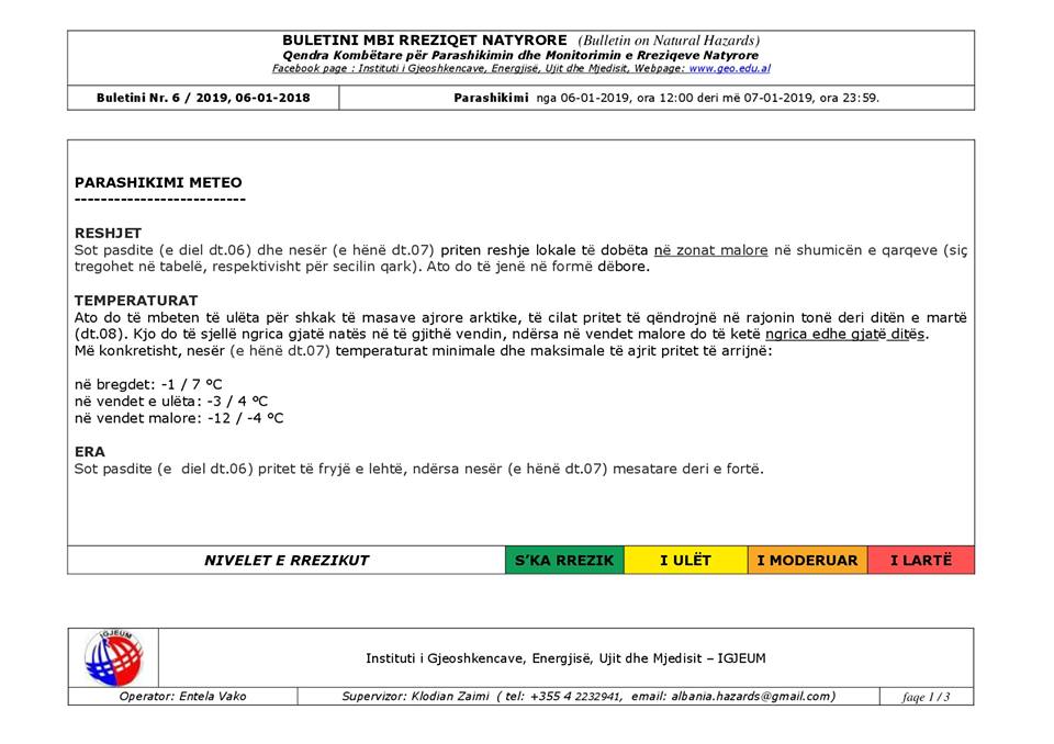 Sot e martë dt.08 priten reshje lokale të dobëta në zonat malore në disa qarqe (siç tregohet në tabelë, respektivisht për secilin qark). Ato do të jenë në formë dëbore.