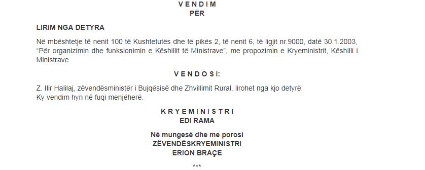 “Në mbështetje të nenit 100 të Kushtetutës dhe të pikës 2, të nenit 6, të ligjit nr.9000, datë 30.1.2003, “Për organizimin dhe funksionimin e Këshillit të Ministrave”, me propozimin e Kryeministrit, Këshilli i Ministrave vendosi Z. Ilir Halilaj, zëvendësministër i Bujqësisë dhe Zhvillimit Rural, lirohet nga kjo detyrë.