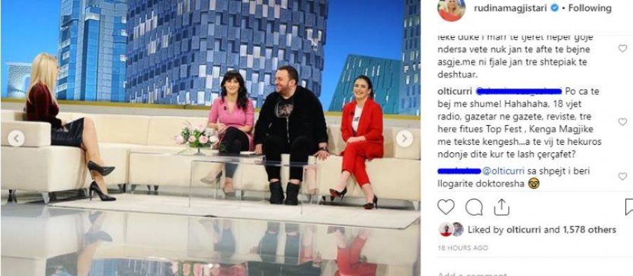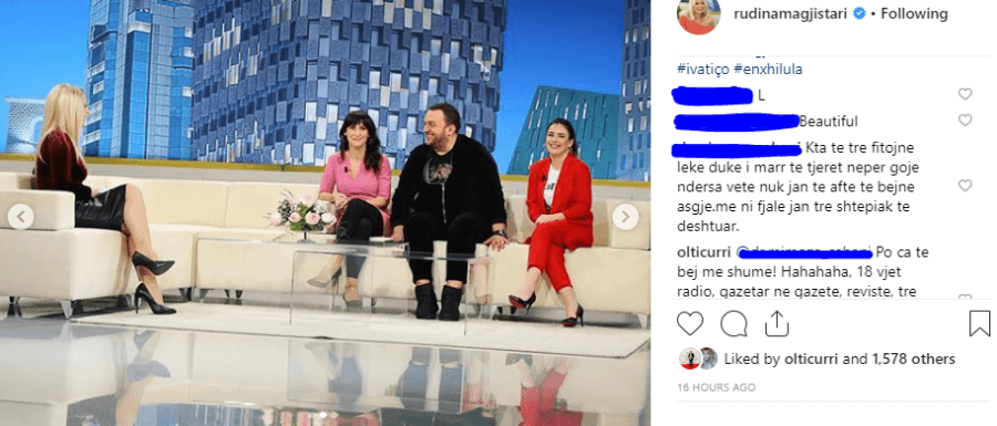 Një ndjekësj ka shkruar në një foto të publikuar nga moderatorja Rudina Magjistari ku shihen tre gazetarët e showbzit Olti Curri,Iva Tiço dhe Enxhi Lula.: “Këta të tre fitojnë lekë duke i marrë të tjerët nëpër gojë, ndërsa vetë nuk janë të aftë të bëjnë asgjë. Me një fjalë janë tre shtëpiakë të dështuar.”