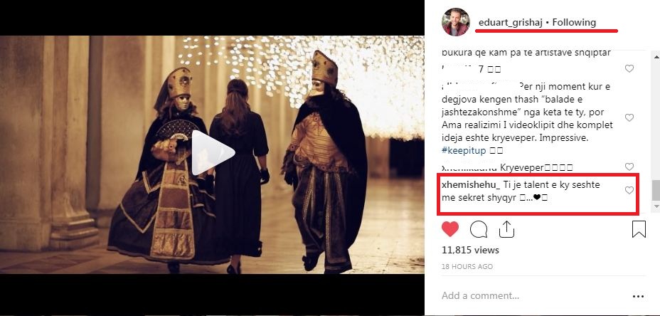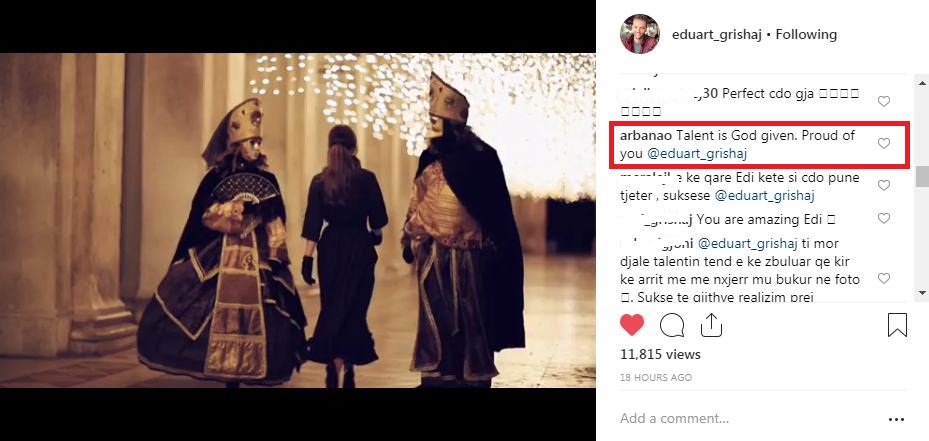 “Talenti është dhuratë nga Zoti. Krenare për ty Eduart Grishaj,” komenton Arbana në postimin e Eduartit, duke e përkrahur në maksimum të dashurin e saj (të përfolur).