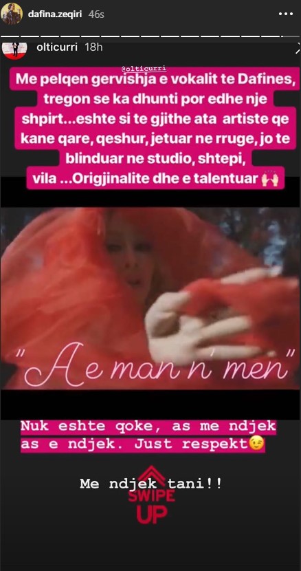 Për Dafina Zeqirin, çuditërisht Olti nuk ka fjalë të këqija, madje nëpërmjet një Instastory ku edhe ia ka shpërndarë këngën ka thënë fjalë të mëdha për të.