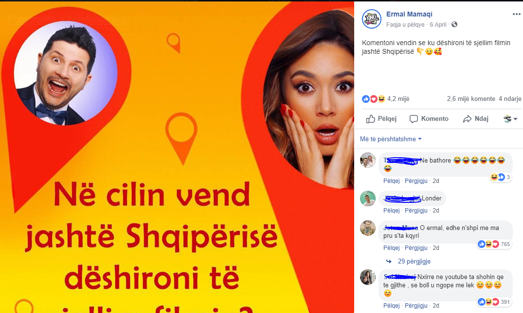 Më herët, Ermali kishte pyetur publikun se ku dëshironin ta shihnin filmin, ku ka patur dhe komente jo të mira. Një komentuese i drejtohej duke i thënë të publikonte filmin në Youtube që mund ta shihnin ta gjithë.