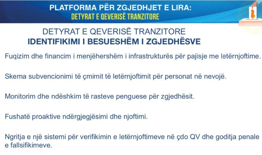 • Ngritja e një sistemi për verifikimin e letërnjoftimeve në çdo QV dhe goditja penale e fallsifikimeve.