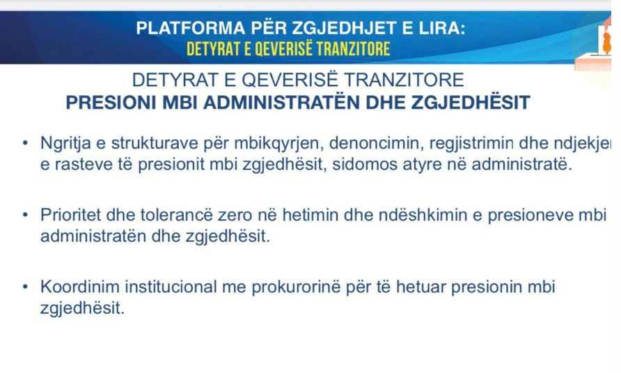 • Prioritet dhe tolerancë zero në hetimin dhe ndëshkimin e presioneve mbi administratën dhe zgjedhësit.