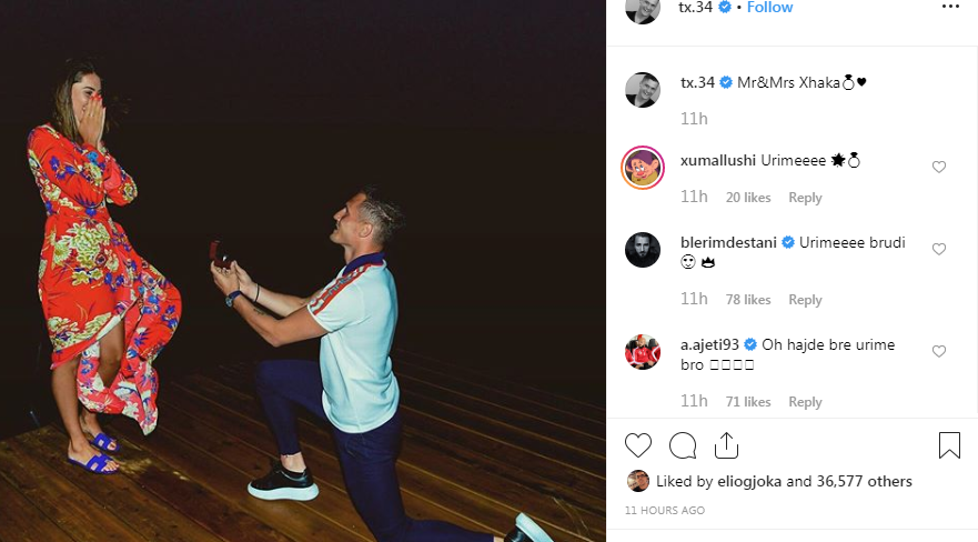 Futbollisti shqiptar, Taulant Xhaka ka vendosur më në fund t’i propozojë në mënyrën më romantike të dashurës së tij bukuroshe, Arbnorës. I ulur në gjunjë mesfushori i Kombëtares ka surprizuar të dashurën dhe duket se ajo është emocionuar shumë.