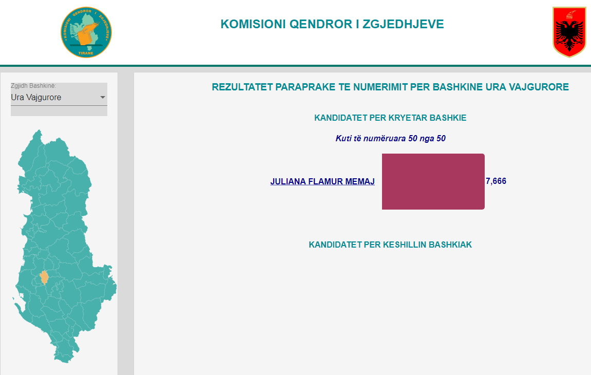 Bëhet fjalë për Juliana Memën, e cila kandidonte për një mandate të dytë në Bashkinë e Urës Vajgurore, e cila nga rezultatet e KQZ-së, kur është mbyllur procesi i numërimit kishte marrë 7,666, ndërkohë që po nga të dhënat e KQZ-së pjesë në zgjedhje kanë qenë 5900.