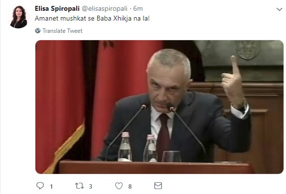 “Amanet mushkat se Baba Xhikja na la!”, shkruan Spiropali, duke shpërndarë edhe një foto të Presidentit Meta gjatë konferencës.