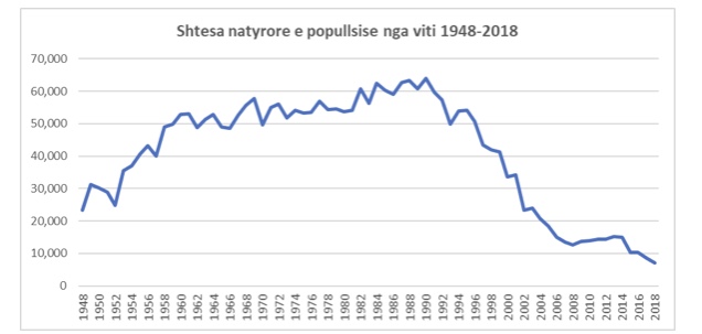 Gjatë vitit 2018, shtesa natyrore e popullsie ishte 7130 persona, niveli më i ulët së paku që nga viti 1948, pak vite pas përfundimit të Luftës së Dytë Botërore sipas të dhënave të INSTAT. Por të dhënat më të hershme, por jo të grupuara vit pas viti, tregojnë se Shqipëria ka shtesën natyrore të popullsisë në nivelin më të ulët që nga viti 1923, pasi shtesa e popullsisë gjatë viteve 1923-1945, sipas të dhënave zyrtare, ishte mesatarisht mbi 18 mijë persona në vit. https://ëëë.monitor.al/shqiperia-drejt-shuarjes-shtesa-natyrore-e-popullsise-ne-2018-n-me-e-uleta-qe-kur-ka-nisur-regjistrimi-ne-1923/