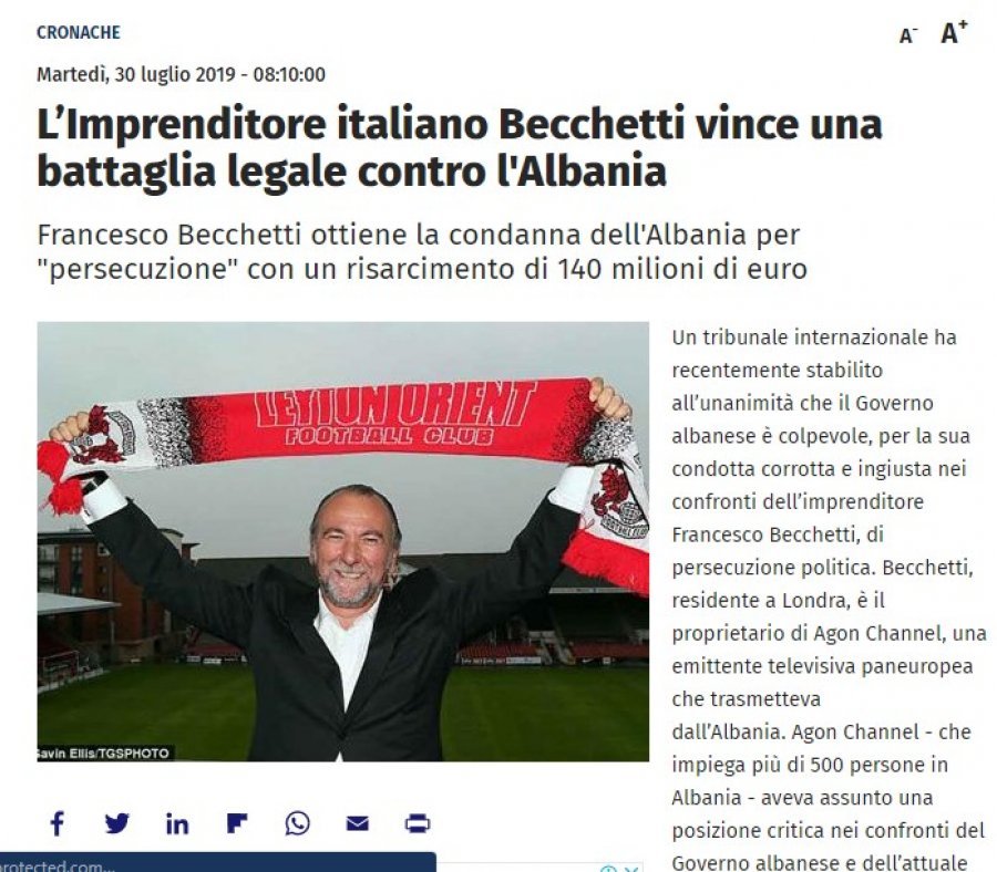 Gjykata ndërkombëtare dënoi Shqipërinë për shpronësimin e paligjshëm të stacionit televiziv Agonset, në shkelje të traktatit të investimeve bilaterale midis Italisë dhe Shqipërisë, dhe urdhëroi pagimin e 140 milion eurove si kompensim ndaj Francesco Becchettit nga Qeveria Shqiptare.