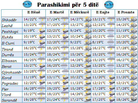 “Rrebeshe shiu dhe stuhi-afatshkurtra ere do te perfshijne vendin ne oret e mesdites dhe deri mengjesin e se martes. Kjo situate e motit mbetet prezent deri ne mesditen e neserme KUR pritet dobesim i ndjeshem i intensitetit te shirave. Era do te jete e forte me shpejtesi mbi 65 km/h duke sjelle probleme ne brigjet detare”,-njofton Meteoalb.