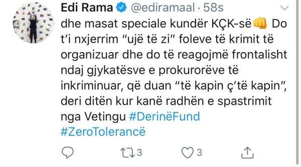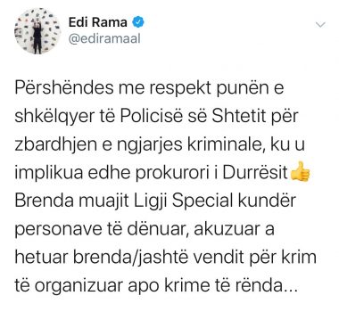 “Përshëndes me respekt punën e shkëlqyer të Policisë së Shtetit për zbardhjen e ngjarjes kriminale, ku u implikua edhe prokurori i Durrësit👍Brenda muajit Ligji Special kundër personave të dënuar, akuzuar a hetuar brenda/jashtë vendit për krim të organizuar apo krime të rënda..dhe masat speciale kundër KÇK-së👊 Do t’i nxjerrim “ujë të zi” foleve të krimit të organizuar dhe do të reagojmë frontalisht ndaj gjykatësve e prokurorëve të inkriminuar, që duan “të kapin ç’të kapin”, deri ditën kur kanë radhën e spastrimit nga Vetingu #DerinëFund ” shkruan Rama.