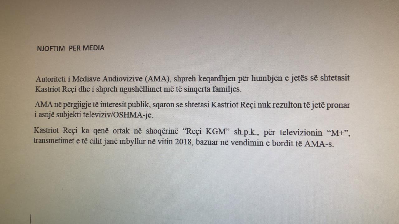 Autoriteti i Medias Audovizive ka reaguar se fundmi lidhur me informacionin, se Kastriot Reçi, i ekzektuar sot në Rreshen, eshte pronar i një televizioni lokal.