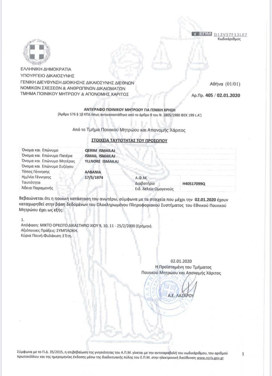 Ai është dënuar për kryerjen e veprimeve të dhunshme, plagosje (rrahje) dhe nuk e ka vuajtur dënimin për shkak të mosgjetjes në territorin grek.