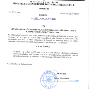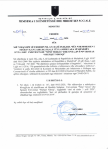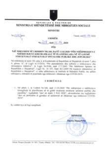 Urdhëri 1: Për ndërprerjen e ndërhyrjeve kirurgjikale në Qendrën Spitalore Universitare ‘Nënë tereza’ dhe spitalin Unibversitar Shefqet Ndroqi deri në përfundim të gjendjes së epidemisë së shkaktuar nga COVID-19.
