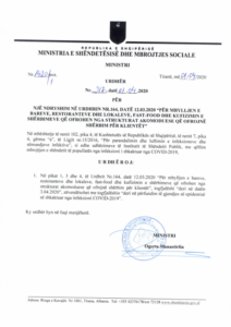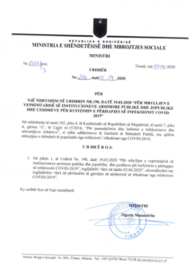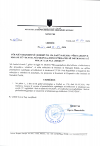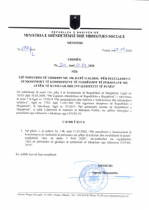 Urdhëri 3: Për pezullimin e funksionimit të komisioneve të vlerësimit të personave me aftësi të kufizuar dhe invaliditetit të punës deri në përfundim të gjendjes së epidemisë së shkaktuar nga COVID-19.