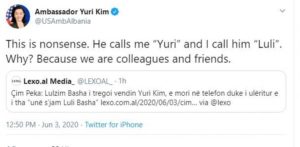 Ambasadorja e SHBA-së në Tiranë, Yuri Kim reagon dhe ndaj komenteve dhe deklaratave qe te tjeret mund te bejne ndaj saj dhe marredhenieve me kreret e partive politike. Ajo ka treguar ditën e sotme se pse kreut të opozitës, Lulzim Basha i thërret shkurt ‘Luli’.