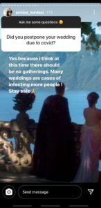 E pyetur nga një ndjekës në Instagram nëse shkak i shtyrjes së dasmës ka qenë Covid, Armina e ka pohuar diçka të tillë.