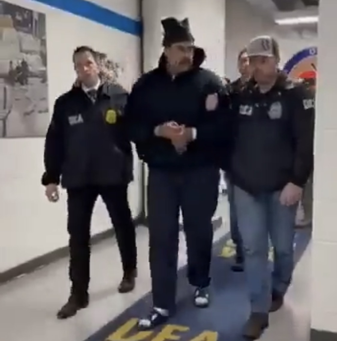 “Krimineli eci”, shkruhej në postimin e “Rapid Response 47”, që shoqëronte pamjet filmike. Në video, Maduro shihet i veshur me një bluzë të zezë me kapuç, duke kaluar përgjatë një korridori të shtruar me qilim blu, ku lexohet mbishkrimi “DEA NYD”, raporton A2 CNN. Gjatë momentit të filmuar, ai dëgjohet teksa uron “Gëzuar Vitin e Ri”.