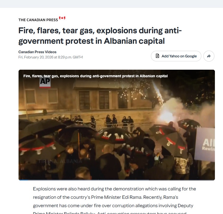 Protesta u shënua nga përplasje mes policisë dhe protestuesve në Tiranë, të cilët kërkonin dorëheqjen e qeverisë për shkak të akuzave të korrupsionit që përfshijnë zv/kryeministren Belinda Balluku. Policia përdori gaz lotsjellës dhe makina ujëhedhëse, ndërsa protestuesit hodhën bombola me benzinë dhe fishekzjarre drejt zyrave të kryeministrit Edi Rama. Demonstruesit brohorisnin ‘Rama ik’ dhe ‘Rama në burg’. Balluku është ndjekur penalisht për manipulim të tenderëve publikë dhe prokurorët kërkojnë heqjen e imunitetit të saj për të mundësuar arrestimin.