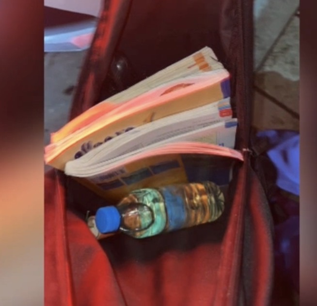 Çanta e një studenti mbushur me libra dhe një molotov dhuratë për kryeministrin
