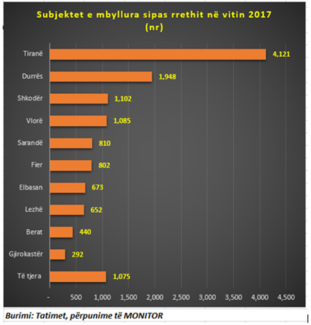 Me këto ritme, rezulton që në Shqipëri janë mbyllur gati 50 biznese në ditë përgjatë vitit 2017, duke përjashtuar fundjavat. Numri më i lartë i subjekteve të mbyllura është në Tiranë, me rreth 4,120. Në Durrës janë mbyllur rreth 1,900 subjekte, në Vlorë 1,085, në Fier 802, në Elbasan 673 (shih grafikun).