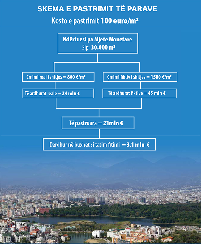 Kompania deklaron të ardhurat nga shitja e apartamenteve me çmim fiktiv. Diferenca midis çmimit real dhe çmimit fiktiv është 700 euro. Për 30 mijë metra katrorë, pastrohen në ekonomi 21 milionë euro të gjeneruara nga aktivitete e jashtëligjshme, për të cilat paguhet tatimfitimi 15%. Kosto e pastrimit të parave për metër katror është 100 euro (21 mln * 0.15/30000), të cilat i shtohen çmimit real.